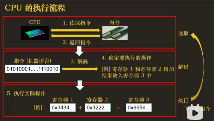 要想获取单元格中的指令(非专业名词),就要知道指令所在的地址,那么这个地址是由操作系统给到 CPU 中一个名叫程序计数器 PC 的硬件(一种寄存器),简单来说,在 x86 兼容 CPU 上,CS 段寄存器和 IP 寄存器两个寄存器就是实现计算机科学中的 PC 这个概念的具体设施(这个在后面会说到,不要急,现在知道名词即可),主要就是理解操作系统当了一个类似中间商的角色