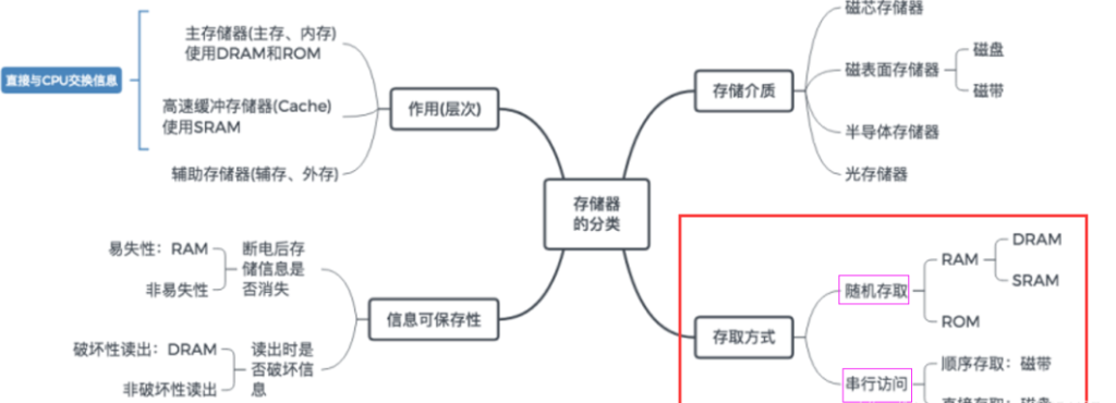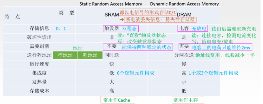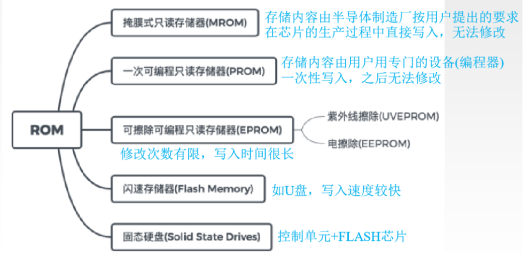 存储器从类型分为随机存储器(RAM)与只读存储器(ROM),随机存储器(RAM)在程序的执行过程中可读可写,必须带电存储,只读存储器(ROM)在程序的执行过程中只读,关机数据不丢失