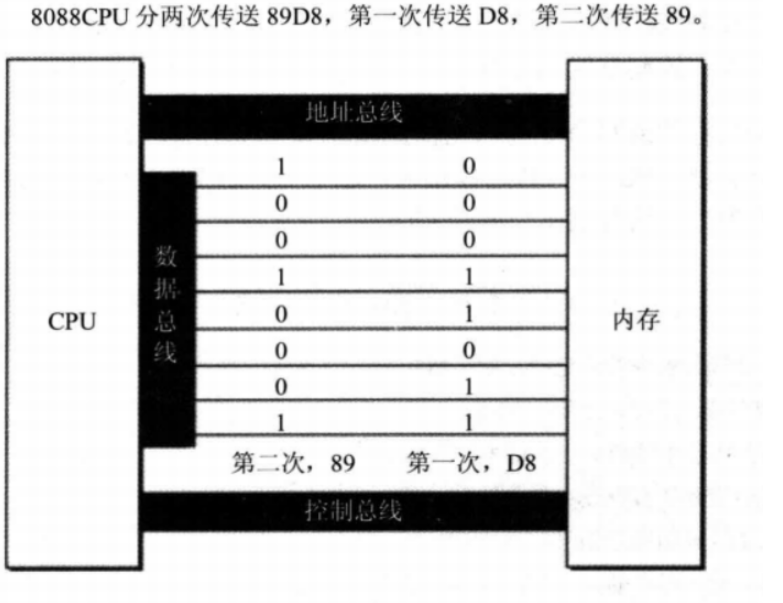 8 根数据线一次可传送一个 8 位二进制数据(即一个字节),传送 2 个字节需要两次;16 根数据线一次可传送 2 个字节(内存对齐核心原理)