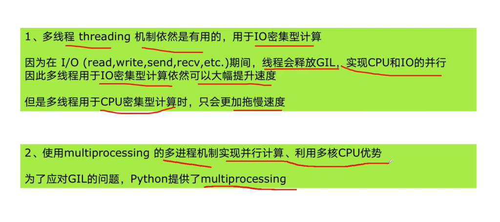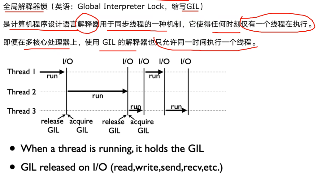 对所有面向 I/O 的(会调用内建的操作系统 C 代码的)程序来说,GIL 会在这个 I/O 调用之前被释放,以允许其他线程在这个线程等待 I/O 的时候运行。如果某线程并未使用很多 I/O 操作,它会在自己的时间片内一直占用处理器和 GIL。也就是说,I/O 密集型的 Python 程序比计算密集型的 Python 程序更能充分利用多线程的好处。