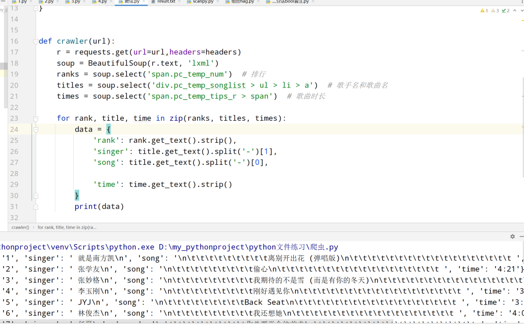 这里用到了 requets 库和 bs4 库,这个没安装的可以安装一下,然后简单写个小 Fuc,目的是爬取一下酷狗音乐的 TOP500 的歌曲