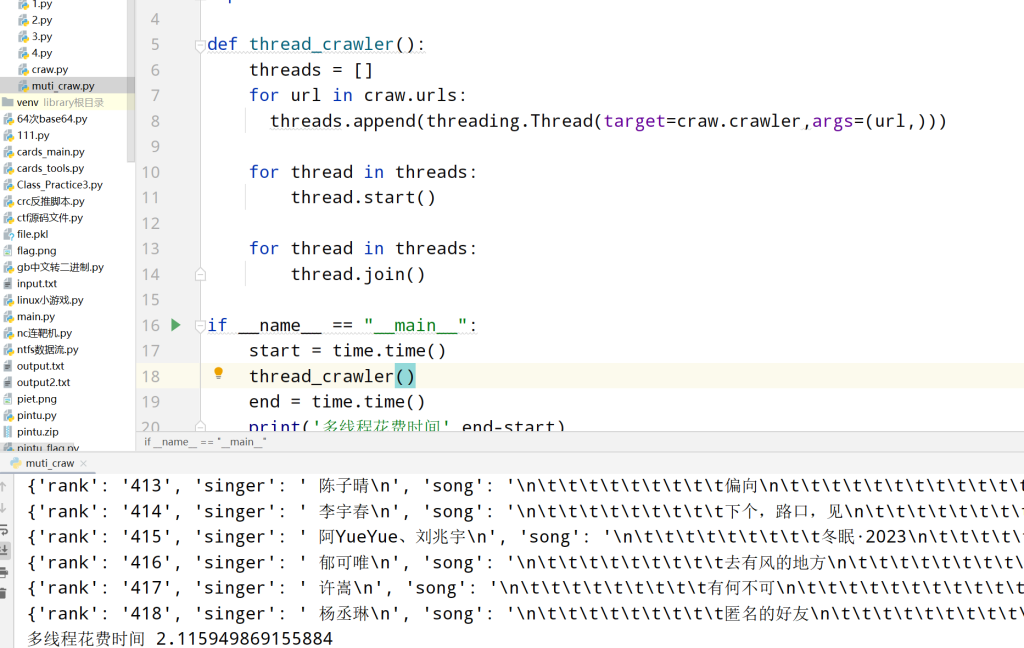 这里就模仿我第二板块给出的第一种示例就行,下面给出代码,这里的话目前就只能创建 url 数目的线程,也就是 23 个,要不然比如创建了 10 个线程,那么最终跑着跑着就会又变成了单线程,这个问题具体怎么解决,用到下节课讲的进程通信(生产者与消费者模式),这里先给出目前水平能写的代码