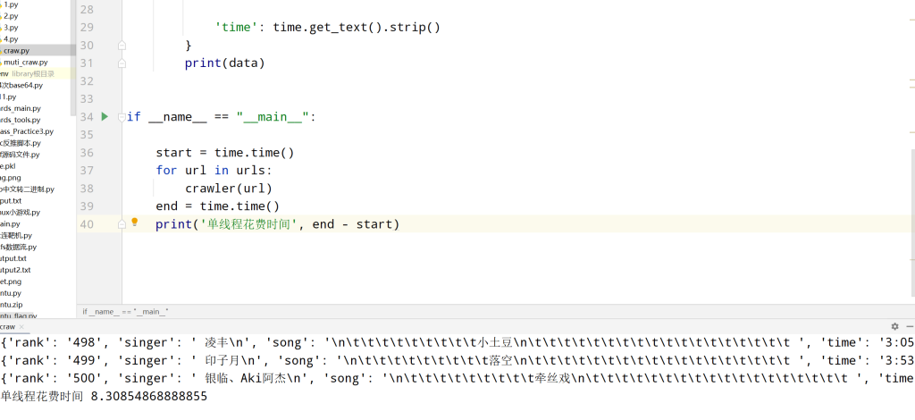 然后咱们来对比看一下,一开始写的单线程的爬取速度