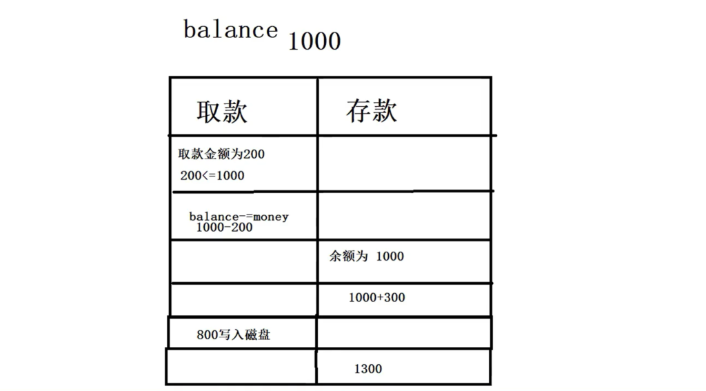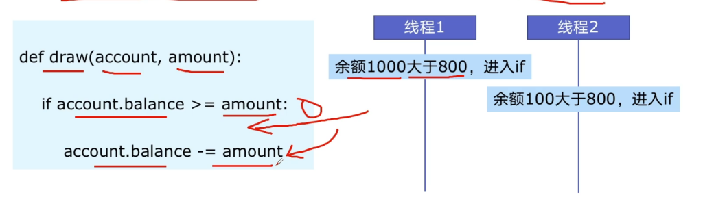 现在的两个线程都是取 800 元,但如果线程 1 刚刚判断完余额是够 800 的,然后要操纵 I/O 流去给机器发指令啥的(咱们下面的具体代码用 time.sleep()去代替),那么此时就会发生线程的切换,但此时余额还没有更新,还是 1000,然后线程 2 也判断余额是够 800 的,那么就导致一下子取出 1600 元,银行就一下子亏 600,这显然是不符合逻辑的