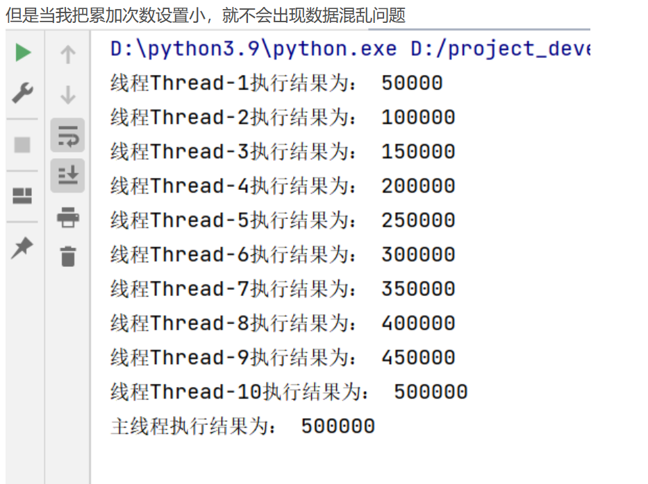 稍微解释一下,这么想,如果两个线程同时加了 1(相隔的时间很短,导致原来 num 还没来及的改变),是不是就会出现这种情况—加了两次但是 num 只增加了 1,所以把这些结果累加起来的话,结果就会小很多,但是如果循环的数字不是 5000000 次,而是一个比较小的数字,那么就不会出现这种情况,因为线程没切换它就已经加完了,下面是师傅设置累加数字小之后的测试结果