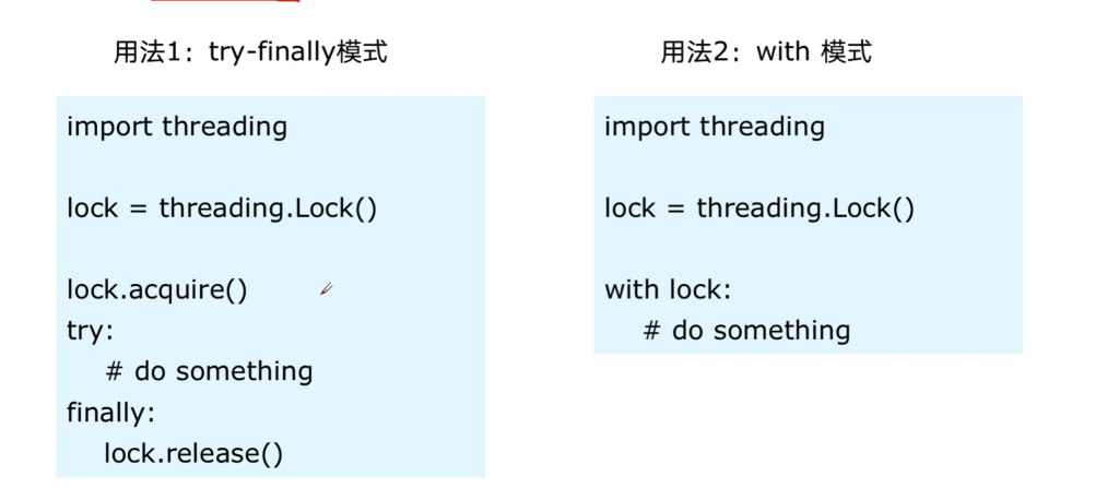 Python 的 threading 模块中有Lock和RLock两个类。他们都有这两个方法