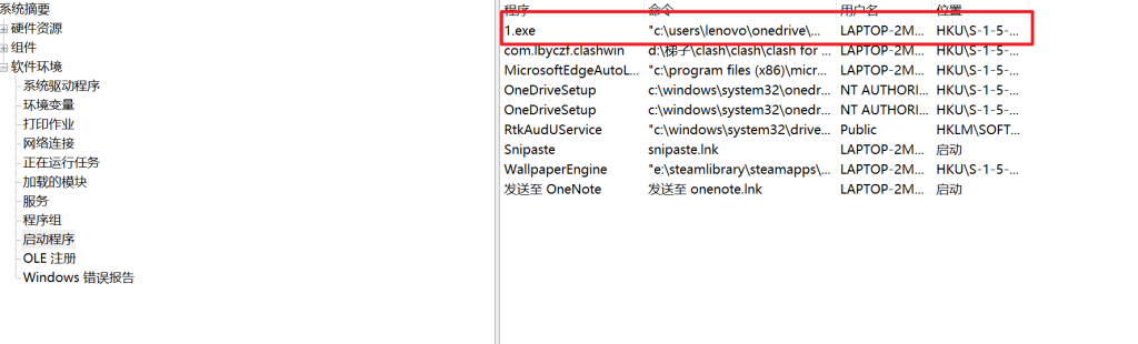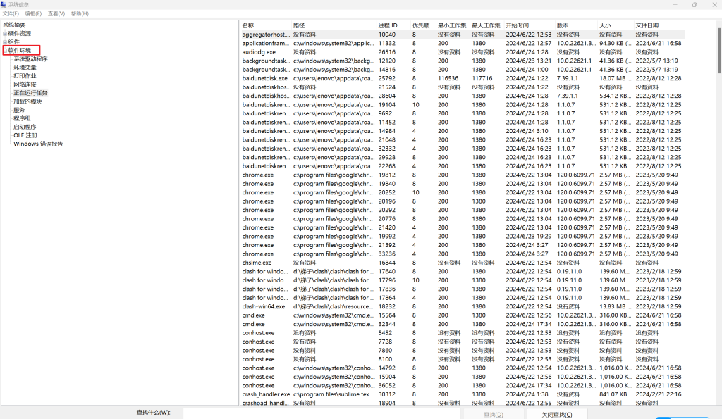 在基础排查的时候可以用命令msinfo32.exe来打开 microfost 系统信息工具查询系统的一个基本的信息,其中主要看的就是其中的软件环境这一个板块,这个就是将在黑框框里面的 systeminfo、set 等指令输出的结果做了一个整合,而且还有这种搜索的功能,所以 Windows 既然有这样好用的图形化界面,那我们用就行了,不用再输什么命令之类的(这个的话最好去用管理员去运行,不然的就像下图一样都是显示没有资料)
