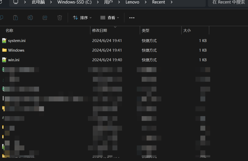 资源管理器输入%UserProfile%\Recent,即可查看最近打开的文件