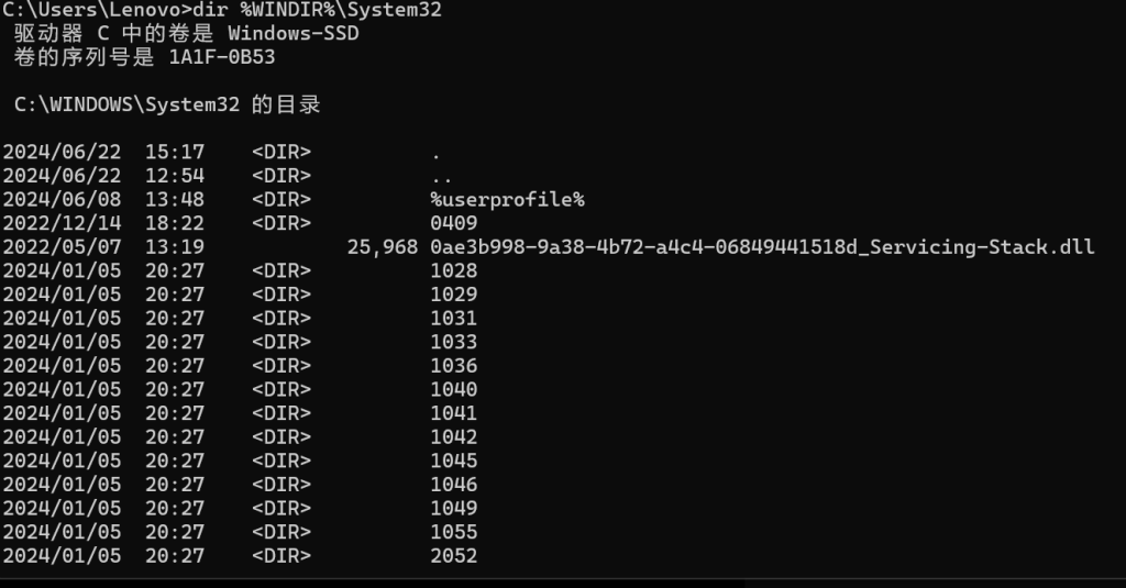dir %WINDIR%\System32是 Windows 操作系统的系统文件夹,是操作系统的神经中枢,文件夹中包含了大量用于 Windows 操作系统的文件