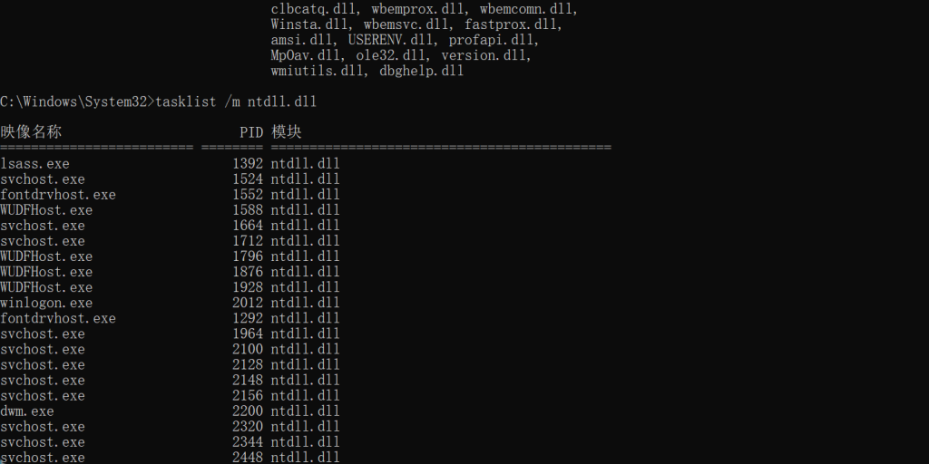 同样的去查看 dll 调用了那些程序可以这么去查tasklist /m ntdll.dll