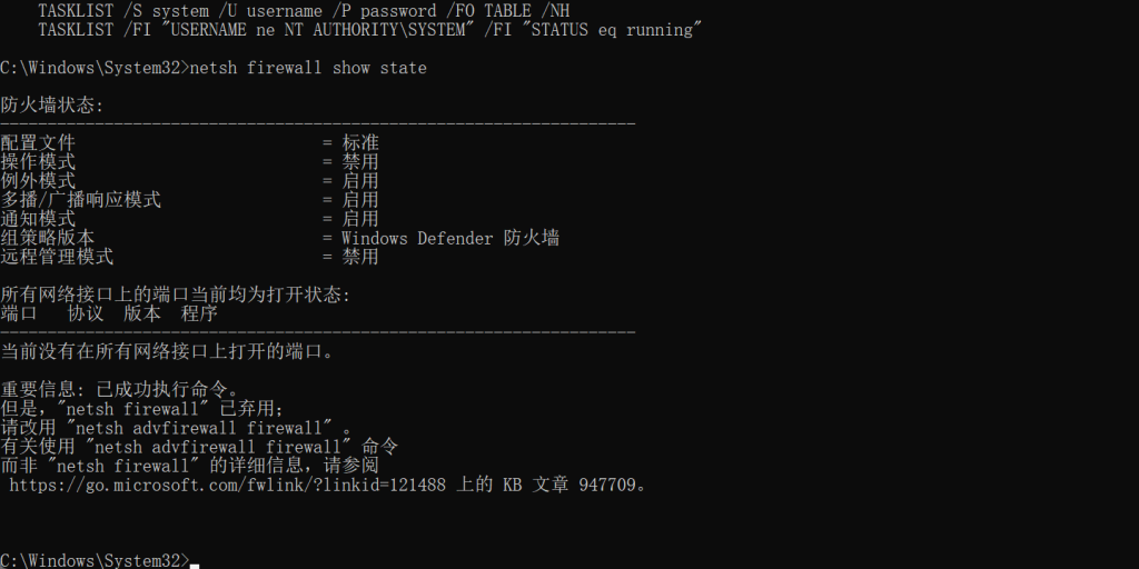 用netsh这个命令去查看,使用netsh firewall show state命令去显示当前防火墙的状态