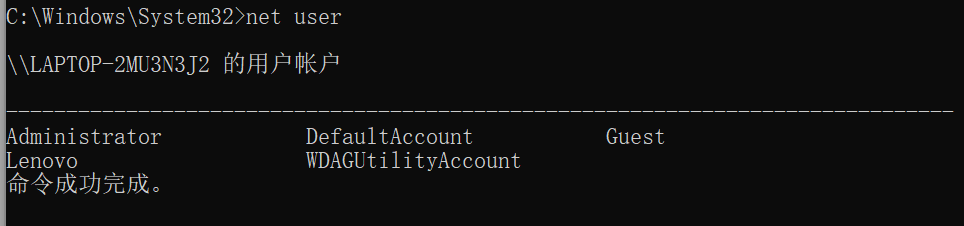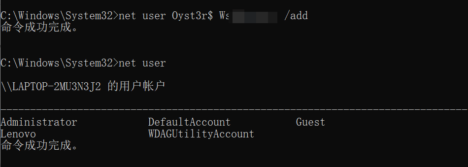 账号后面加上$在命令终端是查看不到的,需要在计算机管理-本地用户和组查看,也可以使用命令 lusrmgr.msc 来查看