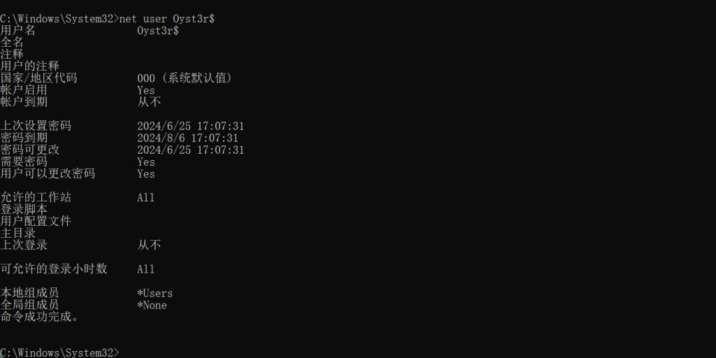 但是用net user Oyst3r$是可以看到这个账户的相关信息的