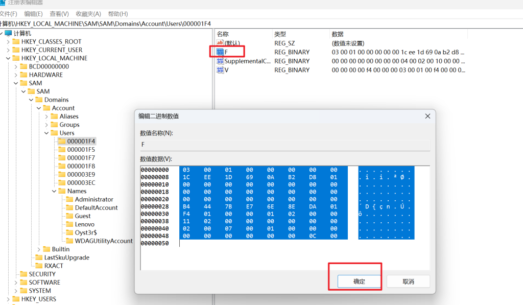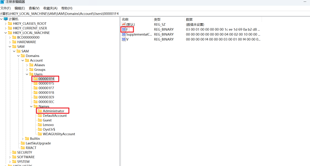 然后我们将 administrator 用户的 F 值复制出来,并把 Oyst3r$这个用户进行替换