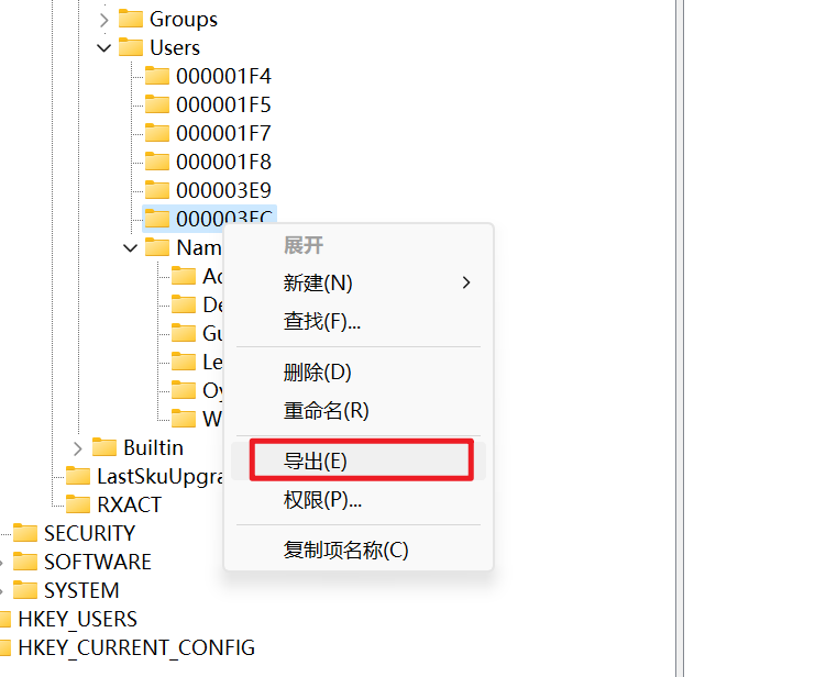 最后将 Oyst3r$ 和 000003EC 从注册表中右键导出,并删除 Oyst3r$用户