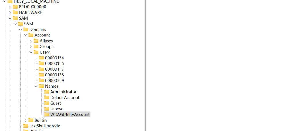 查看注册表,在注册表中 HKEY_LOCAL_MACHINE\SA\SAM\Domains\Account\Users\Names 位置可以看到所有的用户名,将这些用户名与 “控制面板–>用户账户–>管理账户”、”计算机管理–>本地用户和组–>用户”进行对比,不存在的账户就是隐藏账户
