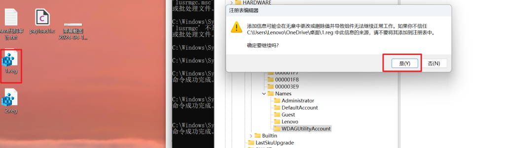 然后将刚刚导出的两个文件重新导入进注册表中即可实现 Oyst3r 用户的隐藏,点击刚刚导出保存的 1 和 2,点击之后会自动导入注册表,下图是导入成功的