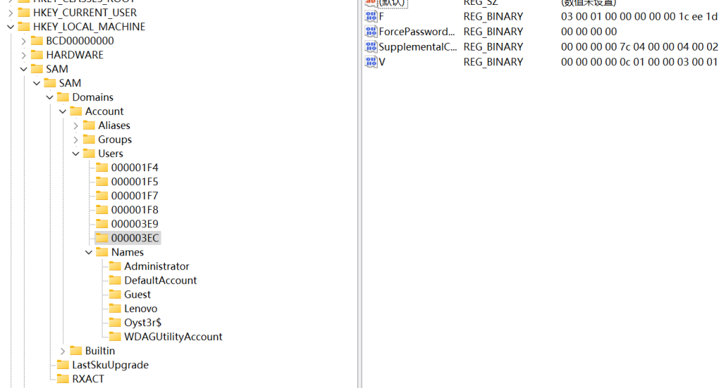 - regedit打开注册表,然后到这个路径–>计算机\HKEY_LOCAL_MACHINE\SAM\SAM\Domains\Account\Users\,如果打开不了的话给当前用户设置一下权限即可,打开以后大概就是这个样子