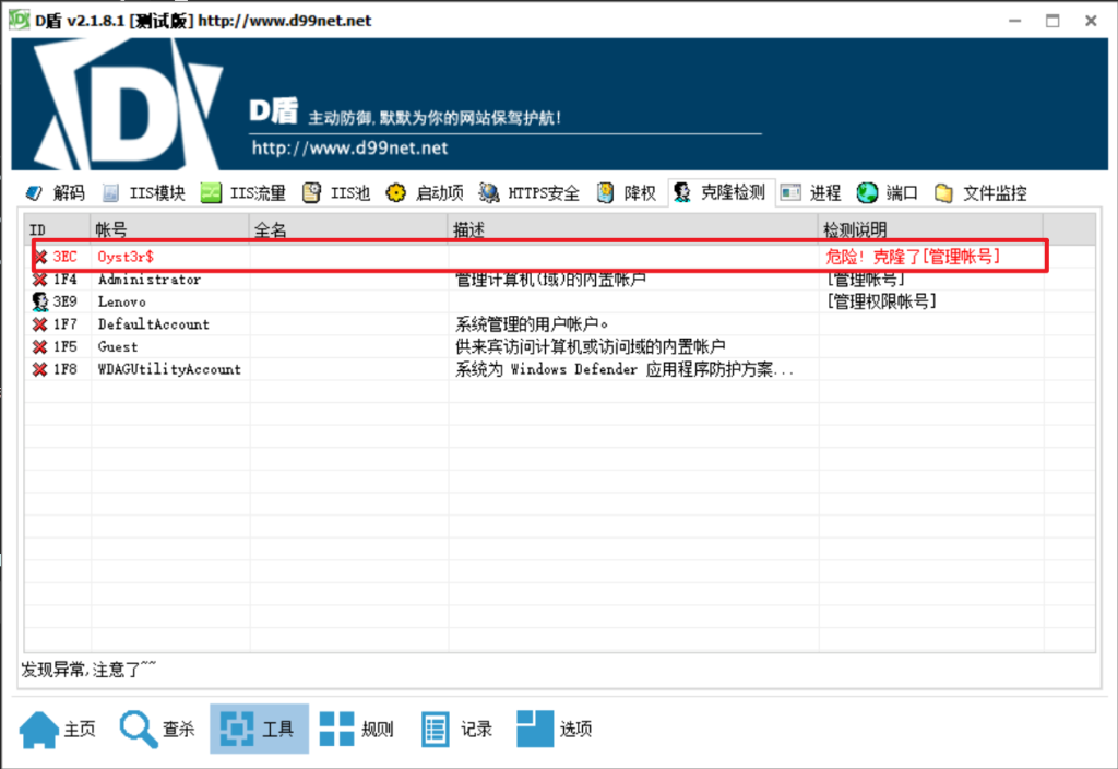 管理员运行 D 盾直接扫一下克隆账户