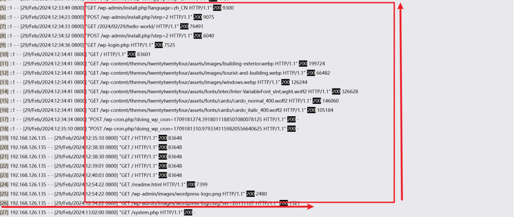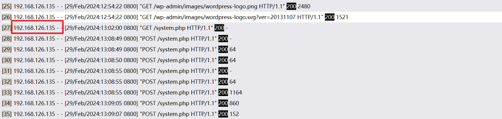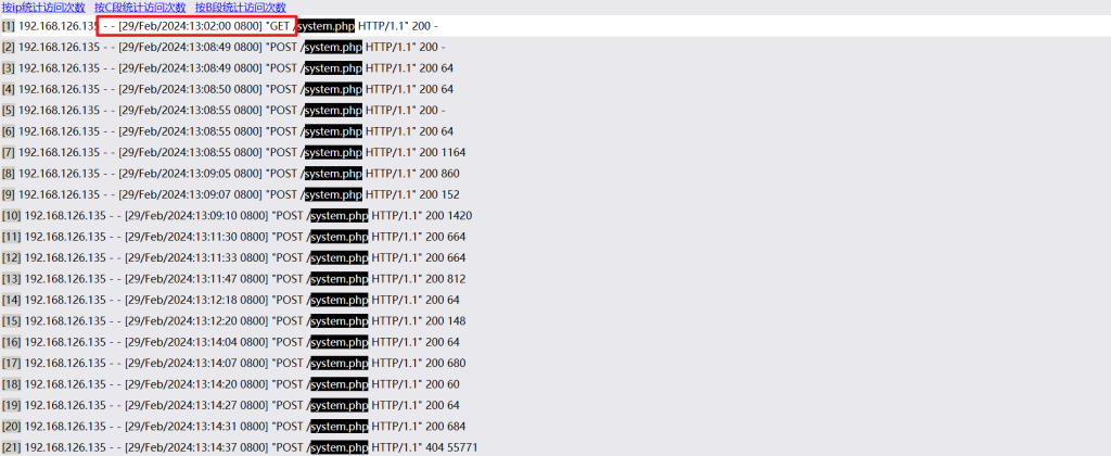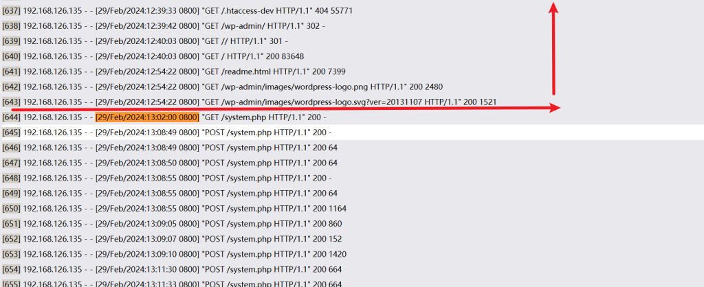然后就去分析 web 日志,结合时间,看看是怎么进来的,捕获 0day 的手段,去找到 apache 的日志如下,查看最早出现 system.php 的时间在这里