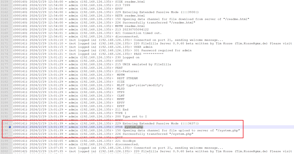 然后看 FTP 服务的日志,一看这个密码这么弱,猜测就是 FTP 被打了,翻日志看有没有 system.php 文件的痕迹,果然是被打了,而且上面有大量的爆破密码的日志