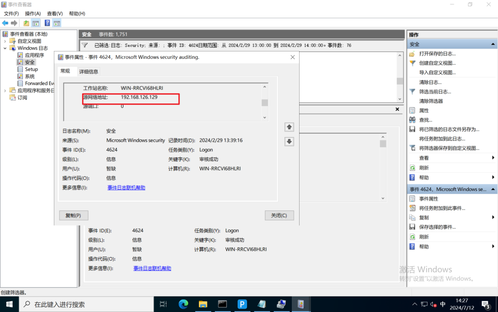 然后去看 Windows 安全日志,得到时间,还原攻击线路就好,这里攻击者创建用户的 IP 和那个扫描器还有去连 Shell 的 IP 还不是一个 IP,这个一定去注意