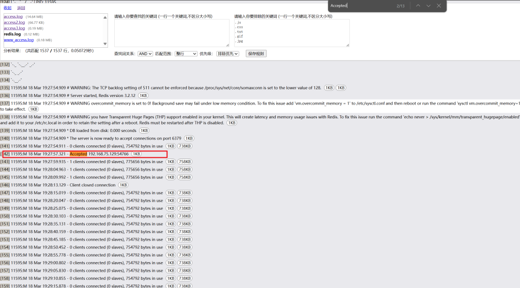 然后往上看,找一下有没有连接成功的,顺便把 IP 和时间点给提取出来