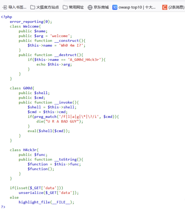 很明显,让令 H4ck3r 类里面的$func让它等于一个对象就可以,然后这个$function()是在 H4ck3r.tostring 里面的,要想要触发这个 tostring()函数的话,就是要先到 Welcome.destruct()函数,因为正则匹配就是针对于字符串的匹配,把这个要匹配的字符串传成一个对象即可。