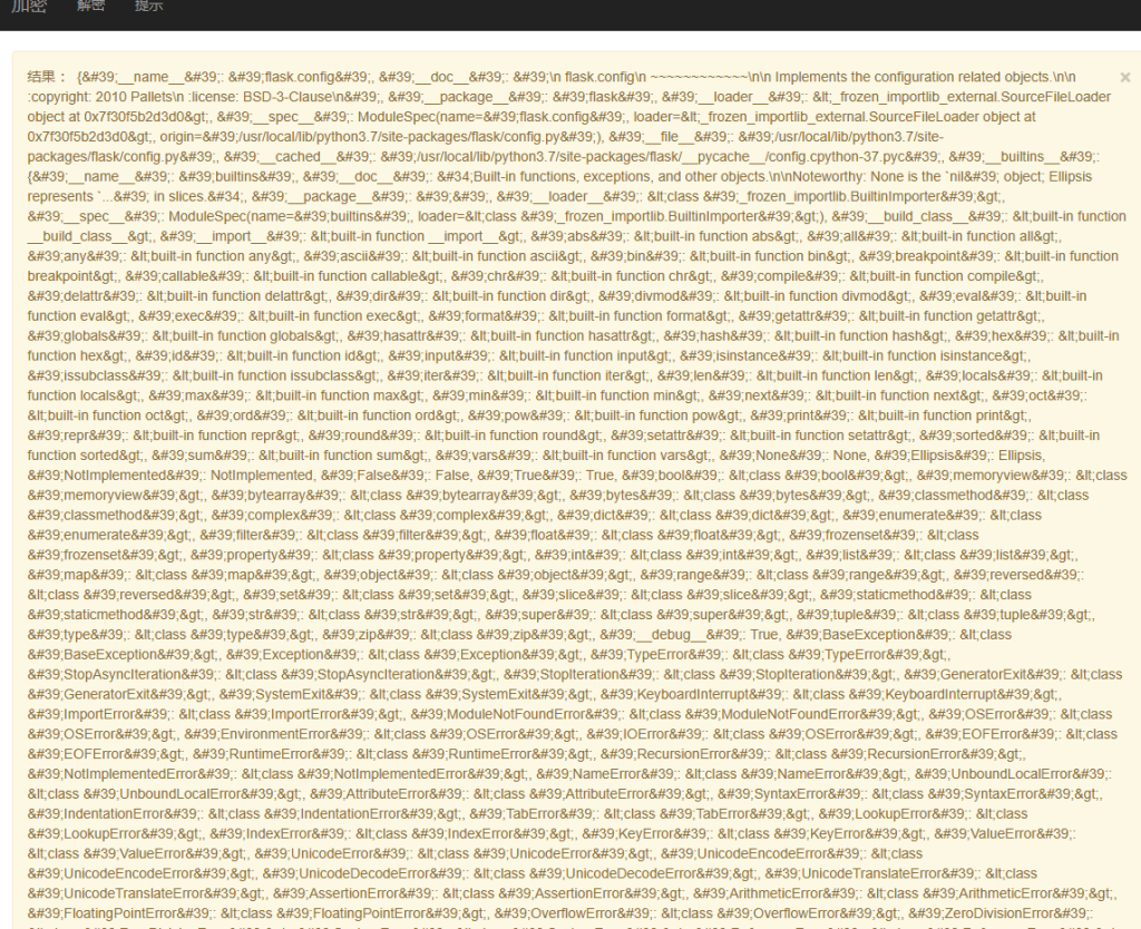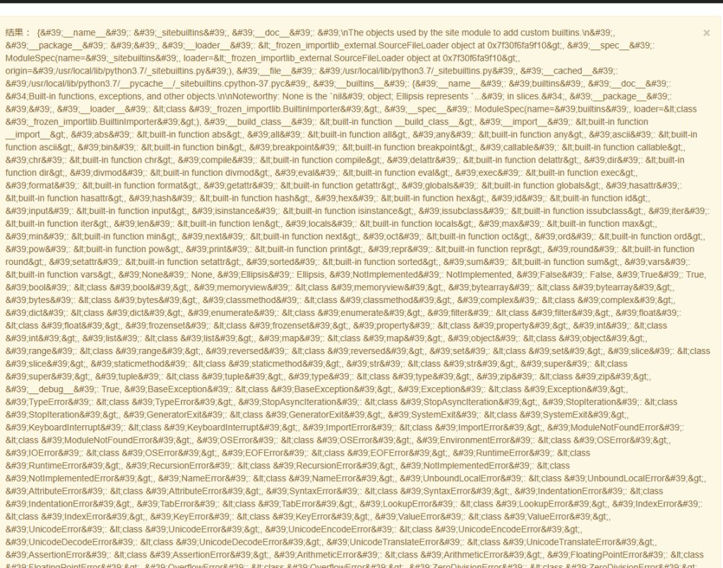 结果发个 nonono,又经过几次测试确定了确实是 os 被过滤了,那就得换思路了,直接从根本出发,直接先得到 object 这个类(这里我就直接给 payload 了,相信大家看完那篇文章一定可以看懂这个 payload,主要这题是加解密绕了一下,不然直接上脚本跑,md,试了好多次才出想要的方法)