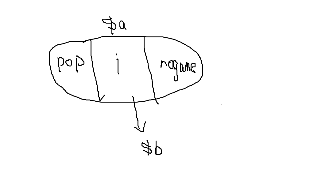 现在应该是这个样子的,他想如果把 pop 再等于$a的话,pop是不是就相当于是包含i了,进一步的话,也是包含$b 的,但你看图,如果 pop 再等于$a的话,大家可能想的是应该就是在pop这个小格子里面继续去分,但其实并不是这样的,就是实实在在的pop完全包含了$a,可能这里有点抽象,它们之间的关系就是一种你包含我,我也包含你的互相包含的关系,下面我也自己写了一个例子
