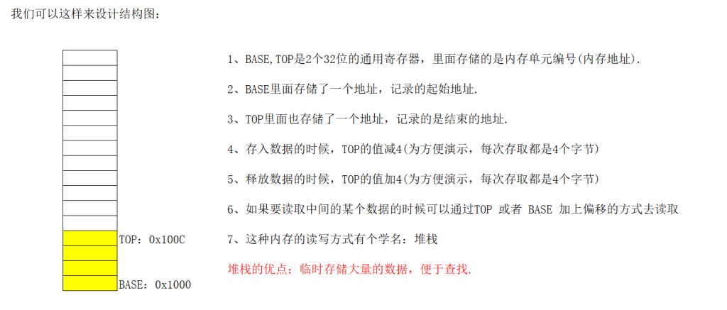 但是当数据数量很大时,我们需要存到内存中,那么现在我们想要一种内存,可以记录存了多少数据,并且能够非常快的找到数据,于是我们可以这样设计内存。用两个寄存器分别存储栈底和栈顶的内存地址,存数据的时候,TOP 值减 4,释放数据时 TOP 值加 4,如果想要读取中间的某个数值时可以通过 TOP 或者 BASE 加上偏移量的方式去读取