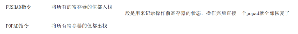 pushad:将八个 32 位通用寄存器中存的值,存入堆栈中,按照顺序存:eax 中的值先入栈,接着是 ecx,edx,ebx,esp,ebp,esi,edi,起到一个记录现场的作用。接着你就可以对寄存器做任意操作,最后反正能还原