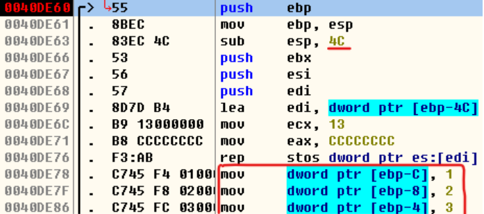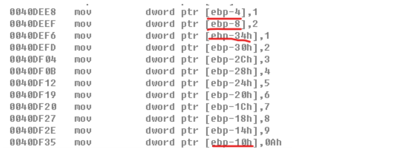 - 接着分析定义局部变量和赋值的反汇编:还是正着存局部变量,现存 x = 1 到[ebp - 4],再试 y = 2 到[ebp - 8],接着是 int r,此时 r 会被分配内存空间[ebp - 0xC],但是没有赋值。接着就是存数组从 1 存到 10,但是从低地址往高地址存,所以从[ebp - 0x34]每隔四个字节一直存到[ebp - 0x10]