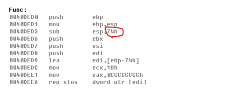 - 因为 Func 函数中定义了 13 个局部变量,小于等于 32 位的任何类型的局部变量都会被分配 32 位内存来存储,所以 VC6 的编译器在提升堆栈时会开辟 0x40 + 0x34h = 0x74 字节的缓冲区