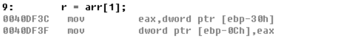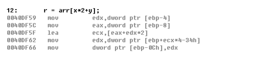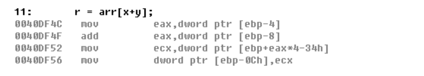 - 如果是 r = arr[x+y];,x 和 y 都是局部变量,所以先把 x 的值从[ebp - 4]中取出来赋到一个寄存器 eax 中,同理也把 y 的值从[ebp - 8]中取出来与 eax 中的值相加后结果赋到寄存器 eax 中,那么 arr[x + y]表示的地址即为[ebp - 0x34 + eax * 4],所以将[ebp - 0x34 + eax * 4]内存中的值取出来赋到一个寄存器 ecx 中,最后将 ecx 中的值赋给局部变量 r 所在内存地址[ebp - 0xC]中即可