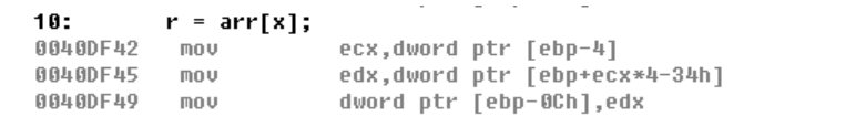 - 如果是 r = arr[x];,x 也是一个局部变量,所以先把 x 的值从[ebp-4]中取出来赋给一个寄存器 ecx,然后因为 arr[0]所在地址为[ebp - 0x34],如果下标为 1,则加一个 0x4;如果下标为 2,则加两个 0x4。所以现在下标为寄存器 ecx 中存的值,那么就是[ebp - 34h + ecx * 4 ]