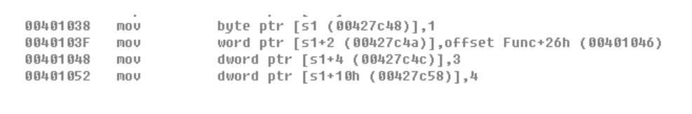 查看反汇编,发现确实是使用基址加偏移量的方式查找的结构体中的数据,而是可以看到 st2 类型的变量 s1 中的数据的地址是固定的,因为结构体类型变量 s1 是全局变量,在编译时就分配了固定的内存空间。且地址是连续但不等宽的。那么就表示给全局变量赋值,就是直接在给全局变量–st2 类型的 s1 分配的内存中修改数据