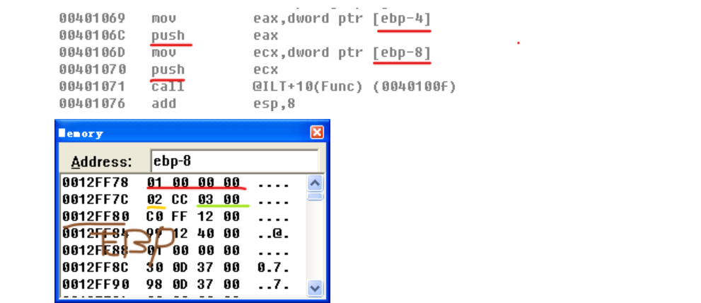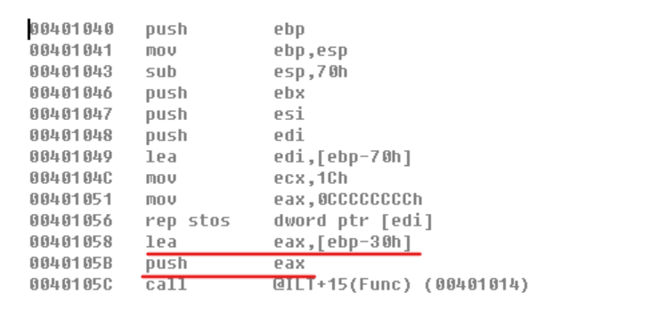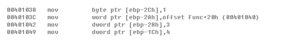 通过汇编代码可以发现,在 call 指令前加了两行指令,因为结构体中还定义了很多类型的变量,光用 eax 和几个寄存器肯定是不够的,那么编译器所做的是,在 main 函数的缓冲区中选一块起始地址[ebp-30h],然后将这个地址作为返回数据存储的起始地址,从这个地址开始往高位地址依次存下去。但是由于 eax 寄存器在进入 Func 函数后要被使用用来存储其他的东西,比如填充 Func 函数缓冲区的时候要用 eax。那么为了不让 eax 中此时存的返回值起始地址丢了,就将它入栈!像参数一样,然后后面进入 Func 函数后通过[ebp + 8]来得到这个值