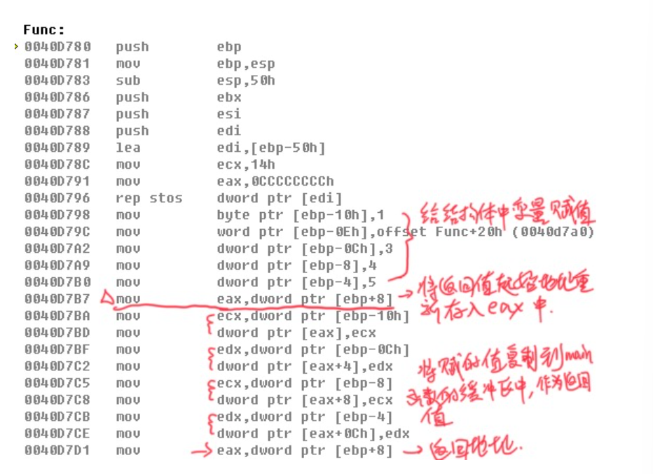 进入函数后可以发现将结构体变量作为返回值,其实就是将在 Func 函数中给结构体中变量赋的值,赋值一份到 main 函数的缓冲区中,就是在未进入 Func 函数是记录的[ebp -30h]这个地址开始往高地址存,最后再把这个返回值存入的起始地址再存入 eax 中作为返回值,即返回了一个地址