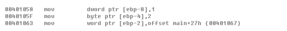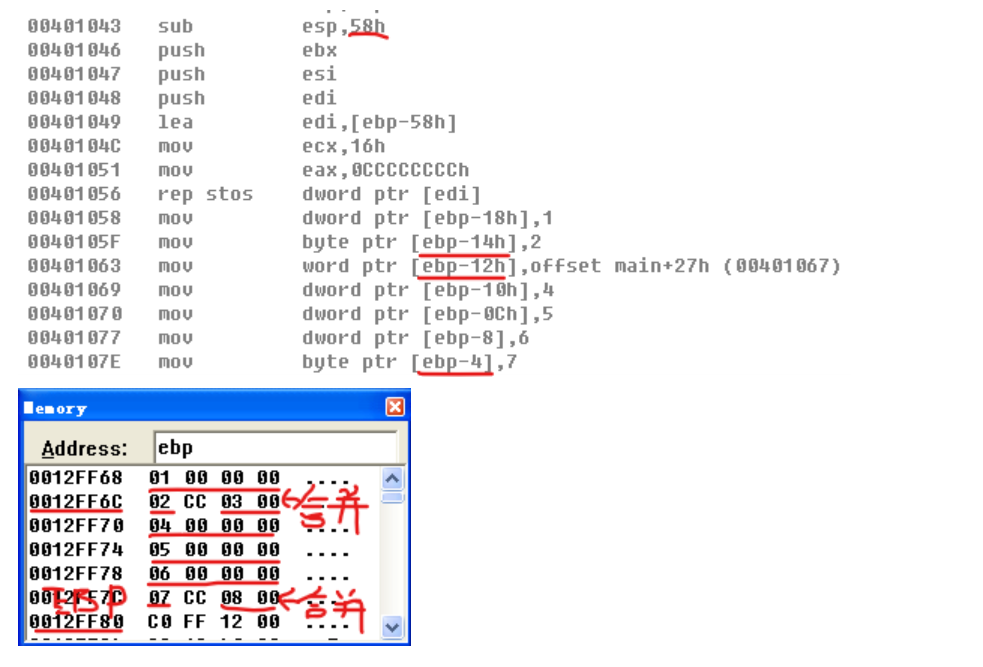 这里注意一点,就是之前最开始说的在函数里面分配变量,看给 0x40h 加多少的问题由于本机尺寸的问题,统一是分 4 个字节,然后引出了数组,数组分的字节虽然是按数据宽度来说的,但在一些情况下还是要遵循本机尺寸的问题,同样的结构体也是要遵循的,这个问题叫做结构体对齐,会在下篇文章中具体讲