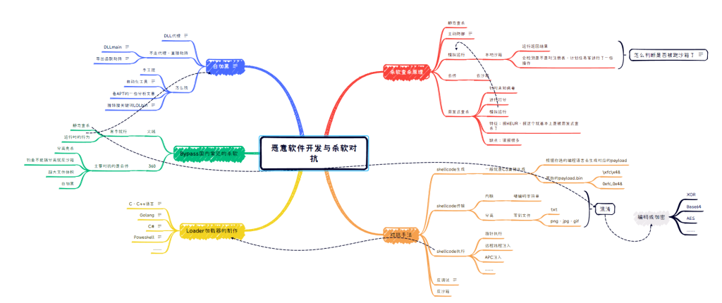 这个就是免杀学习的一个思路吧,大体就是从 shellcode 的生成,传输,执行这三大过程,衍生出来的一系列的对抗手法。