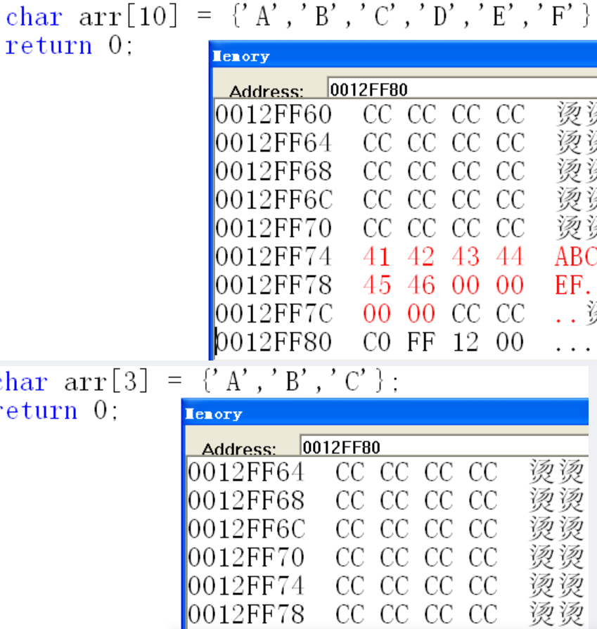 char arr[10] = {'A','B','C','D','E','F'}; //编译器默认在结尾添加0x00