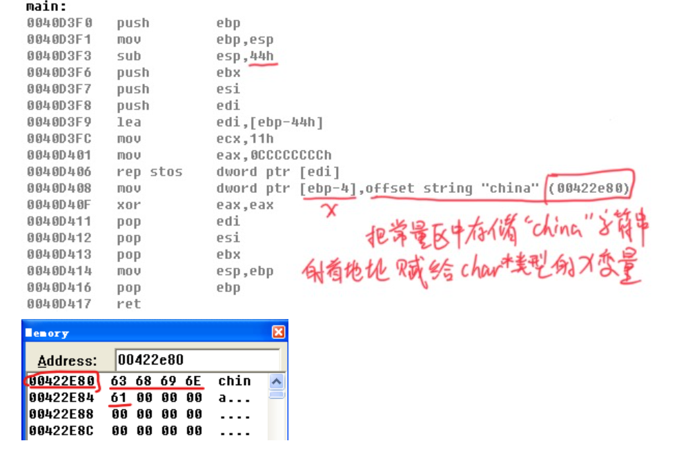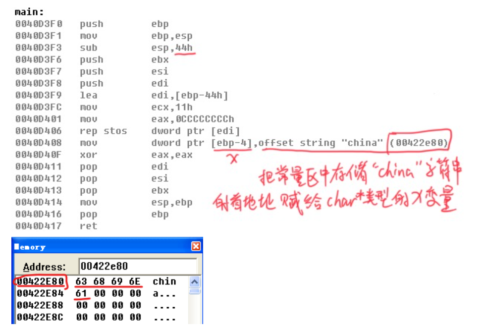 *类型的局部变量,所以会提升堆栈空间为 0x40 + 0x4 = 0x44;而后我们发现反汇编中的操作就是将已经存储在常量区(内存中的某个区域)的字符串”china”的首地址 0x422E80 存入了给 char类型变量 x 分配的内存中(main 函数的缓冲区),即char类型的变量 x 存储的是”china”字符串在常量区中的首地址