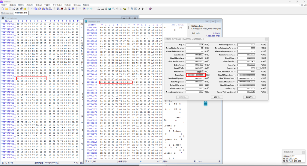 此时文件在 4GB 虚拟内存中的起始地址,就是 imagebase,一般为 0x00400000,接着就可以通过 imagebase + addressofentrypoint 找到文件装载到内存后真正的程序入口地址;或者用 imagebase 加上一些偏移地址值就可以得到文件其他内容在运行时装入 4GB 内存后的地址