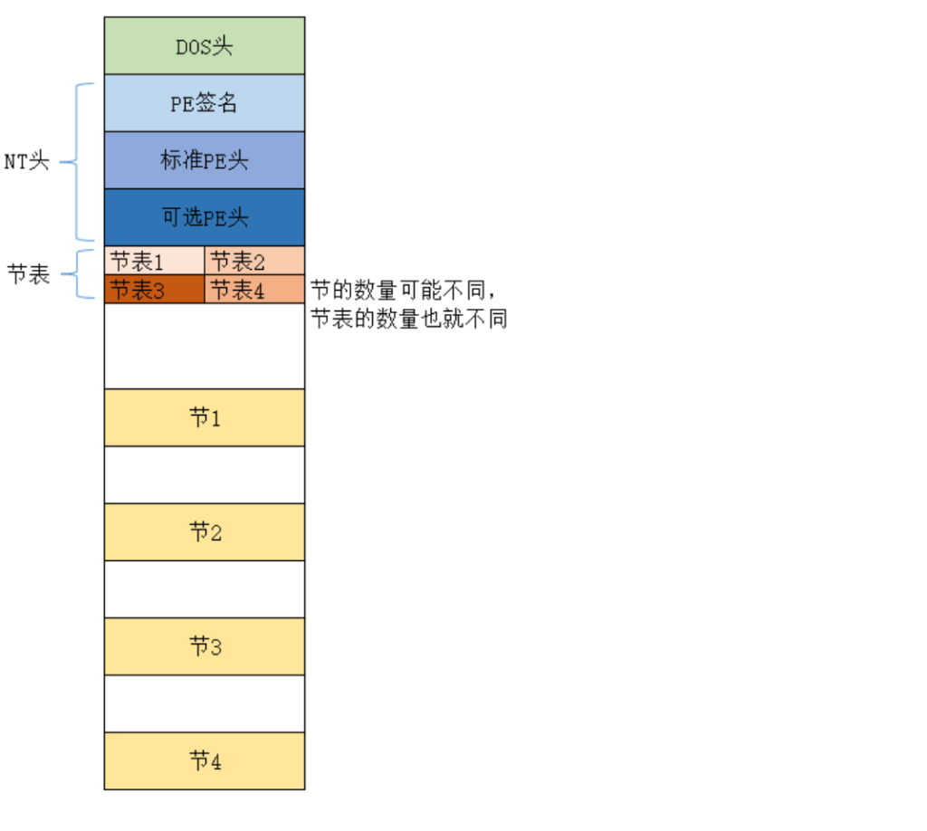 - 节表是表,肯定不止一个数。一个 PE 文件有多少个节,就有多少个节表!每一个节表的大小是确定的,40 字节,如何确定有多少个节:可以通过标准 PE 头中的 NumberOfsections 字段的值来确定;确定了有多少个节,就确定了有多少一个节表,一个节表记录管理一个节的信息。一个 PE 文件从哪里开始是节表(硬盘上的地址):DOS 头大小 + 垃圾空位 + PE 签名大小 + 标准 PE 头大小 + 可选 PE 头大小(需要查);我们知道 DOS 头大小固定为 64 字节;PE 签名大小为 4 字节;标准 PE 头大小固定为 20 字节;可选 PE 头大小可以通过标准 PE 头中的 SizeOfOptionalHeader 字段的值来确定