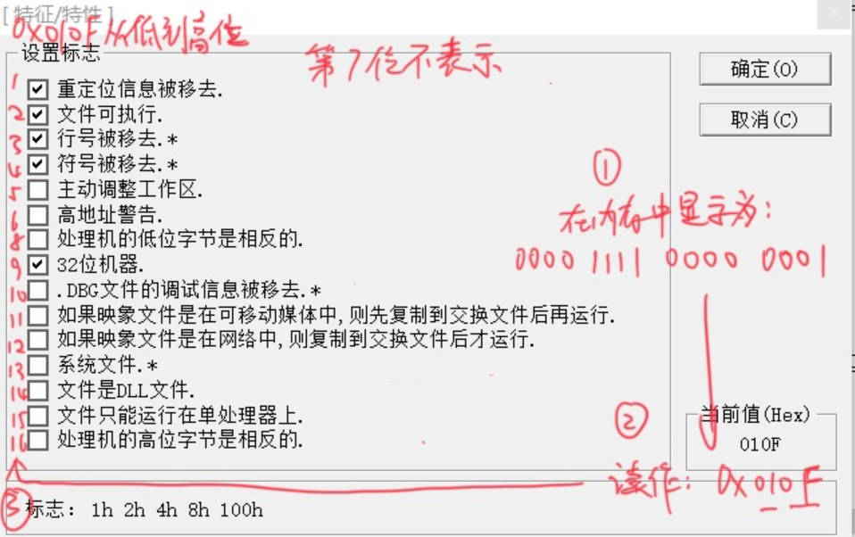 Characteristics:16 位的每个位都表示不同的特征,可执行文件值一般都是 0x010F,即读完后 16 位二进制数中从低到高第 1、2、3、4、9 位上的值为 1,其他位为 0,下面是每一位的 1 含义