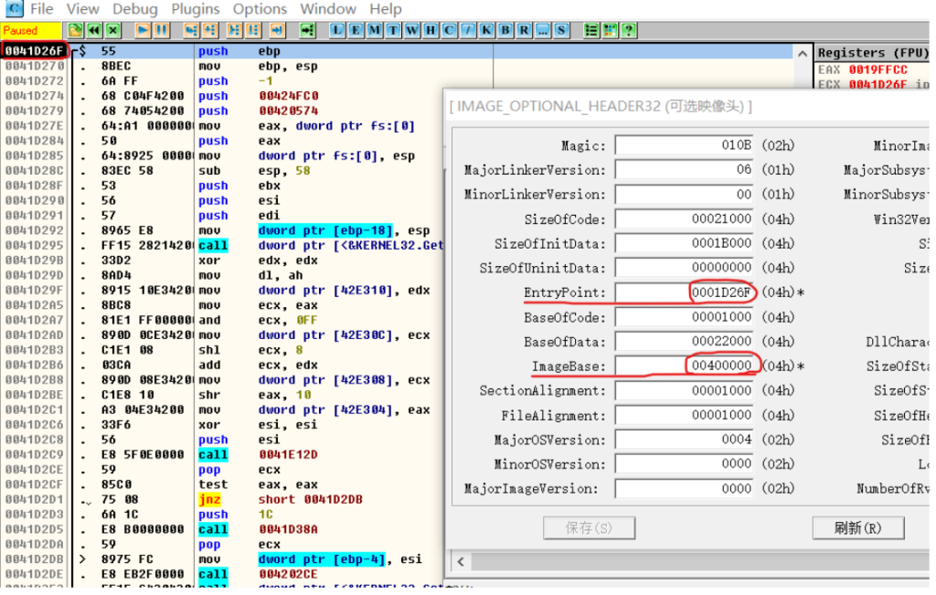 内存中的程序入口地址:使用 OD 打开文件(完全模拟文件运行时加载到内存中的状态,不是硬盘上的状态)。所以 OD 打开一个可执行文件后,会在程序入口地址处设置断点,让程序停下来,这里就是文件在内存中真正的入口点。即文件装入到 4GB 虚拟内存中的起始基地址 +相对于文件首地址的偏移的程序入口地址,即 imagebase + AddressOfEntryPoint