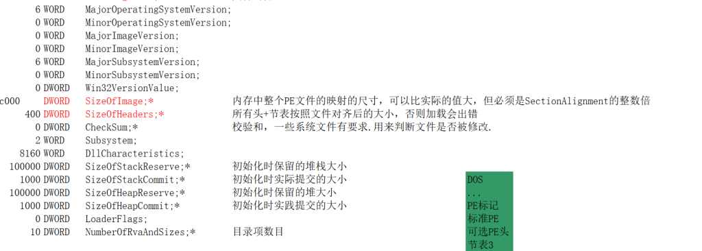 SizeOfImage:内存中整个 PE 文件的映射尺寸:即文件运行时装入 4GB 虚拟内存后的整个文件数据大小(要考虑内存对齐)。可以比实际的值大(比如文件对齐为 0x200,内存对齐为 0x1000 时),但必须是 SectionAlignment 的整数倍