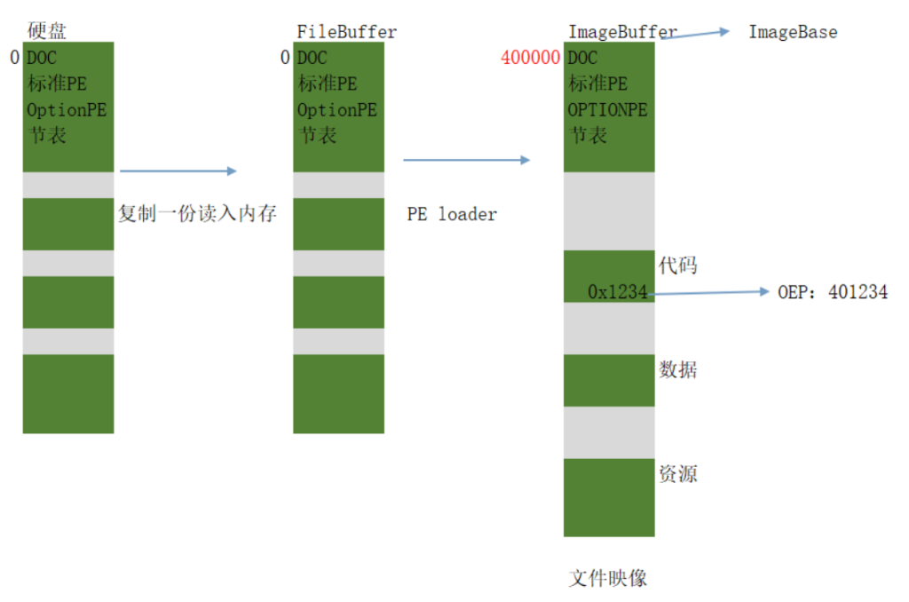 FileBuffer:通过 winhex 或者十六进制编译器打开一个存储在硬盘上的可执行文件,打开后显示的数据就是文件在硬盘上的状态。此过程只是将文件在硬盘上时的数据原封不动的复制一份到内存(FileBuffer)中,我们称这块内存叫 FileBuffer,通过软件显示出来。此时文件的格式还不具备 windows 运行格式